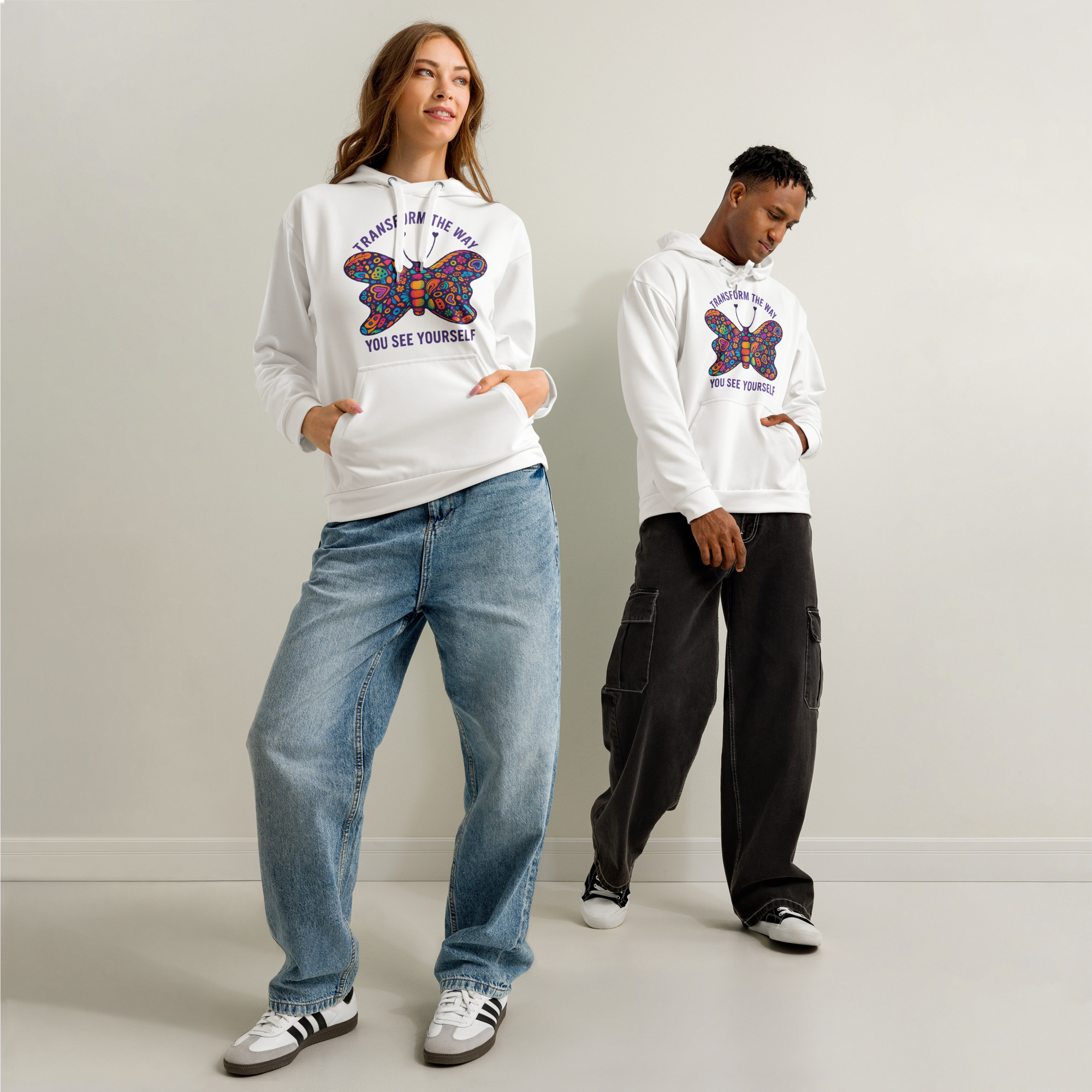 Slip into your transformation era, darling. This hoodie is basically a soft, cozy pep-talk you can wear. With its relaxed unisex fit and cottony goodness, it’s perfect for those “I’m leveling up” days and those “I’m cocooning on the couch” days. The all-over Transform Yourself design turns you into a walking reminder that growth is sexy, change is powerful, and you are absolutely built for your next chapter. Wear it to create, to wander, to hug strangers (consensually, of course), or to strut into the world like the evolving masterpiece you are.